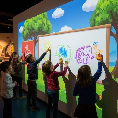 プロジェクションペインティングゲームは使いやすいです。子供は、提供されたタッチスクリーンタブレットデバイスに動物のスケッチを描きます。その絵はシステムによって壁に投影され、アニメーション化されてそこでパフォーマンスを行います。動物をなでると、猫の場合はゴロゴロ、鳥の場合は羽ばたくなど、特定の反応が引き起こされます。これは、アートと科学の完璧な組み合わせです!